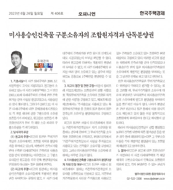 [한주경칼럼406호] - "미사용승인건축물 구분소유자의 조합원자격과 단독분양권"_2023.06.26