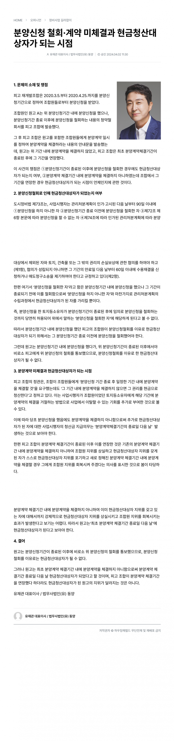○ 2024.04.02. [하우징칼럼] 분양신청 철회·계약 미체결과 현금청산대상자가 되는 시점