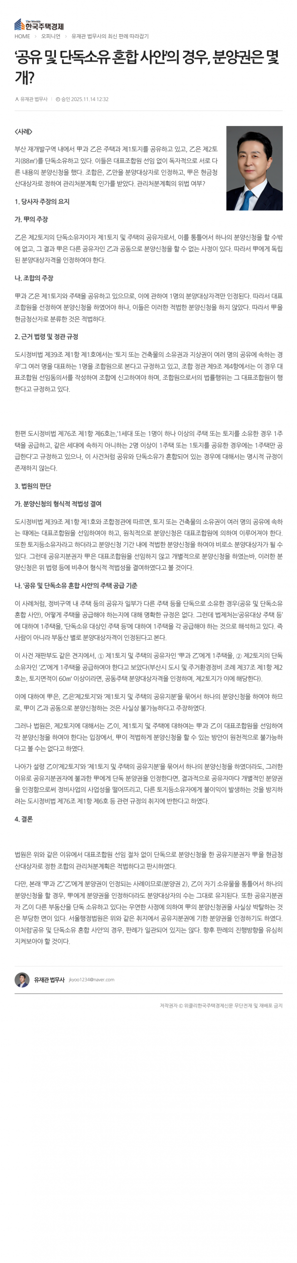 ● 2025.11.14. [한주경칼럼] ‘공유 및 단독소유 혼합 사안’의 경우, 분양권은 몇 개